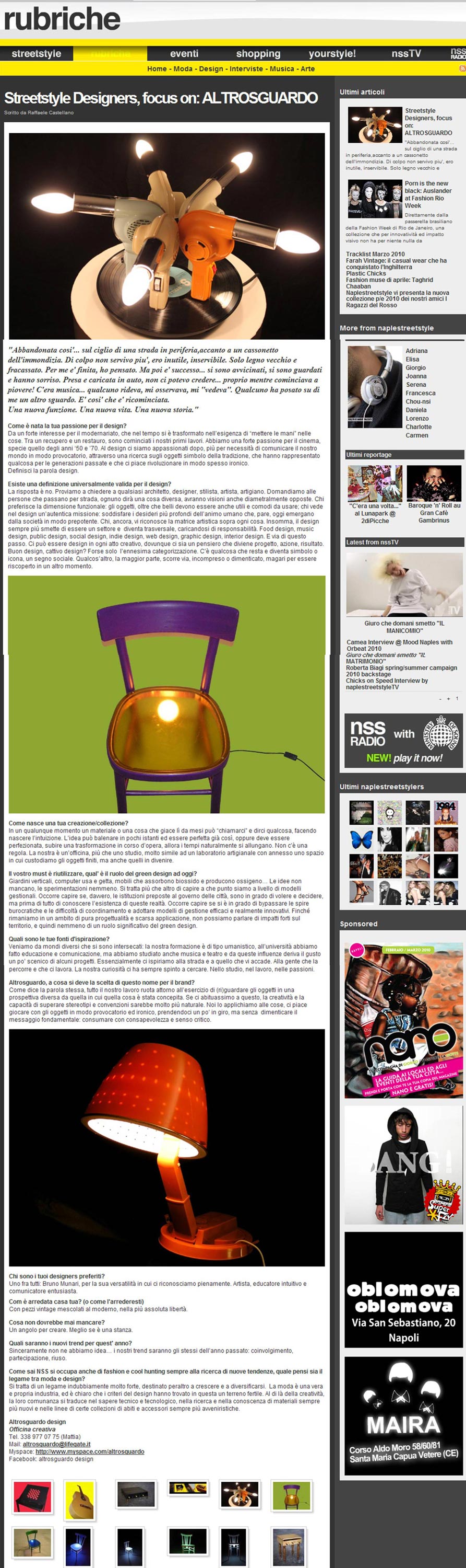Naplestreetstyle – Marzo 2010 Posted on March 25, 2010 by Altrosguardo .:. Art & Design Intervista ad Altrosguardo sul blog Naplestreetstyle Clicca sull’immagine per ingrandire Interview with Altrosguardo on Naplestreetstyle blog Click image to enlarge Share this: Share on Facebook (Opens in new window) Facebook Share on X (Opens in new window) X Share on Pinterest (Opens in new window) Pinterest Share on LinkedIn (Opens in new window) LinkedIn Share on Tumblr (Opens in new window) Tumblr Email a link to a friend (Opens in new window) Email Like Loading...