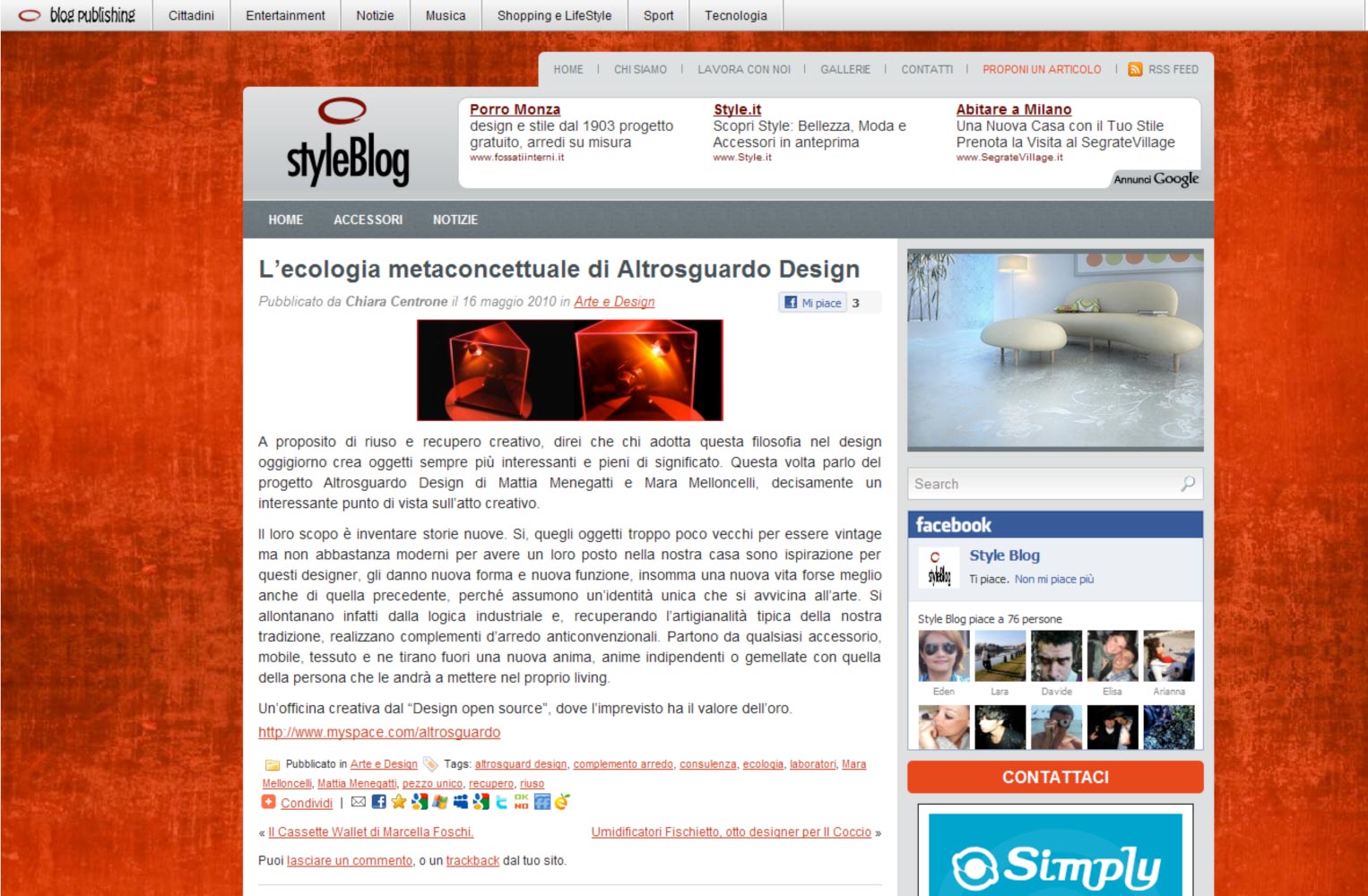 Style Blog – Maggio 2010 Posted on May 25, 2010 by Altrosguardo .:. Art & Design Altrosguardo su Style Blog Clicca sull’immagine per ingrandire Altrosguardo on Style Blog Click image to enlarge Share this: Share on Facebook (Opens in new window) Facebook Share on X (Opens in new window) X Share on Pinterest (Opens in new window) Pinterest Share on LinkedIn (Opens in new window) LinkedIn Share on Tumblr (Opens in new window) Tumblr Email a link to a friend (Opens in new window) Email Like Loading...